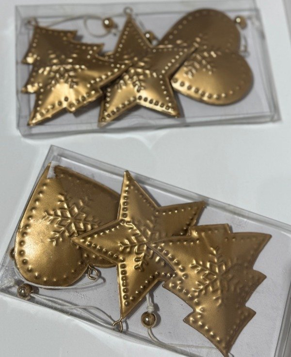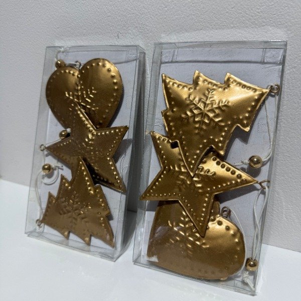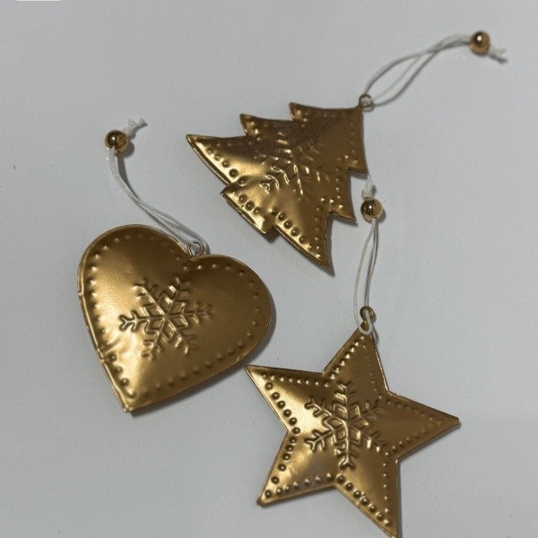 .Set de adornos de navidad con forma de estrella, corazón y árbol con motivo de renos. Color dorado.